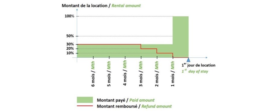 - Moins de 1 mois avant le 1er jour de location : Aucun remboursement ne sera effectué, 100% du montant de la location est dû au bailleur.